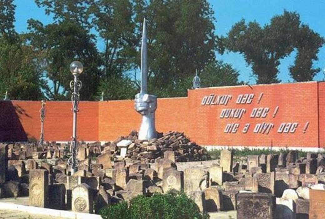 This erasure of memory was particularly violent in the dismantling of the Memorial to the Victims of the 1944 Deportation in Grozny. Inaugurated in 1992 under the presidency of Dzhokhar Dudayev, this monument was a profoundly symbolic work in the eyes of the Chechen people, who finally saw the hundreds of thousands of victims of the tragic deportation of February 23, 1944 honored as they deserved. The structure consisted of hundreds of churts (traditional gravestones) that Soviet authorities had torn from cemeteries after 1944 to use as construction material for roads, bridges, and pigsties. At the center of the monument stood a clenched fist gripping a saber before an open Qur’ân, bearing the inscription in Chechen: